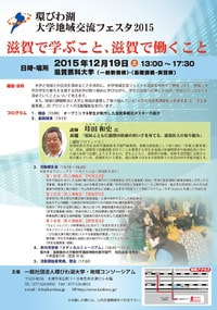 平成27年度は20プロジェクトを支援していますが、以下のとおり、その活動を報告・発表する「環びわ湖大学地域交流フェスタ2015」を開催します。県内の大学や地域から多くの教員、学生、地域住民の皆様が集まるこの機会に、より多くの人に、大学と地域の取り組みを知っていただき交流を深めていただければと思います。