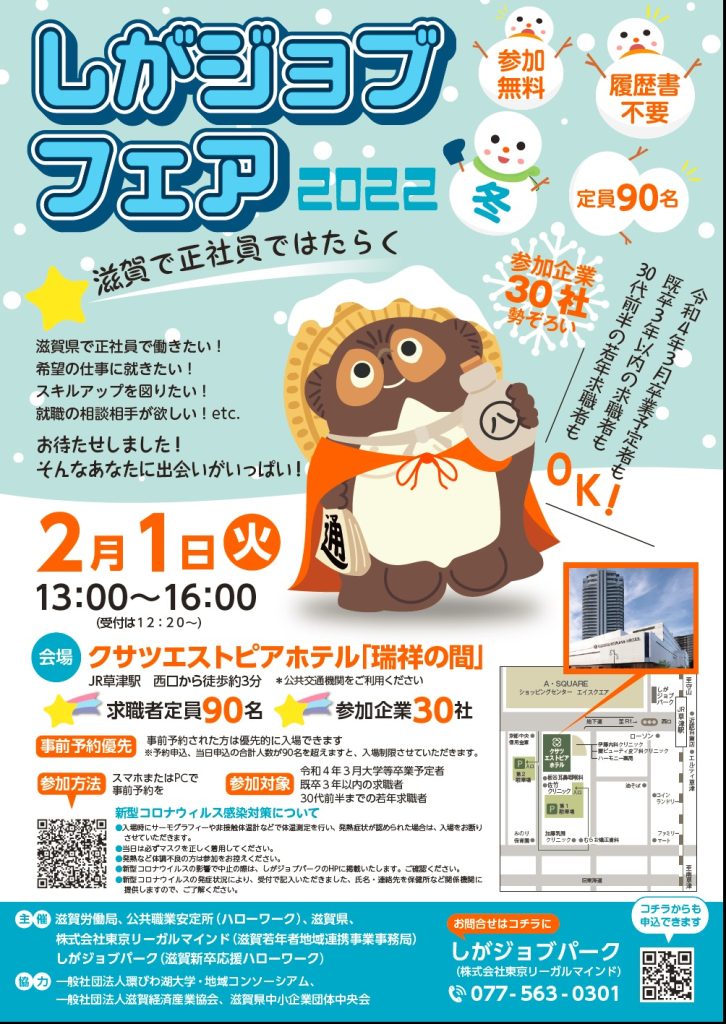 ≪主催≫ 滋賀労働局、公共職業安定所(ハローワーク)、滋賀県、株式会社東京リーガルマインド(滋賀若年者地域連携事業事務局)、しがジョブパーク(滋賀新卒応援ハローワーク)