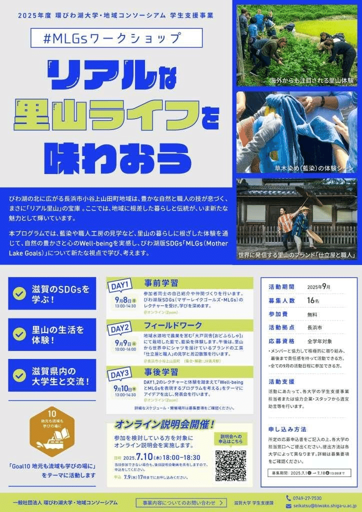 今年度の学生支援事業では、「リアルな里山ライフを味わおう」をテーマに、藍染体験や職人工房の見学など、里山の暮らしに根ざした多彩なプログラムを通じて、自然の豊かさや心のWell-beingを体感しました。また、びわ湖版SDGs「MLGs(Mother Lake Goals)」について、新たな視点から学び、考える機会になりました。