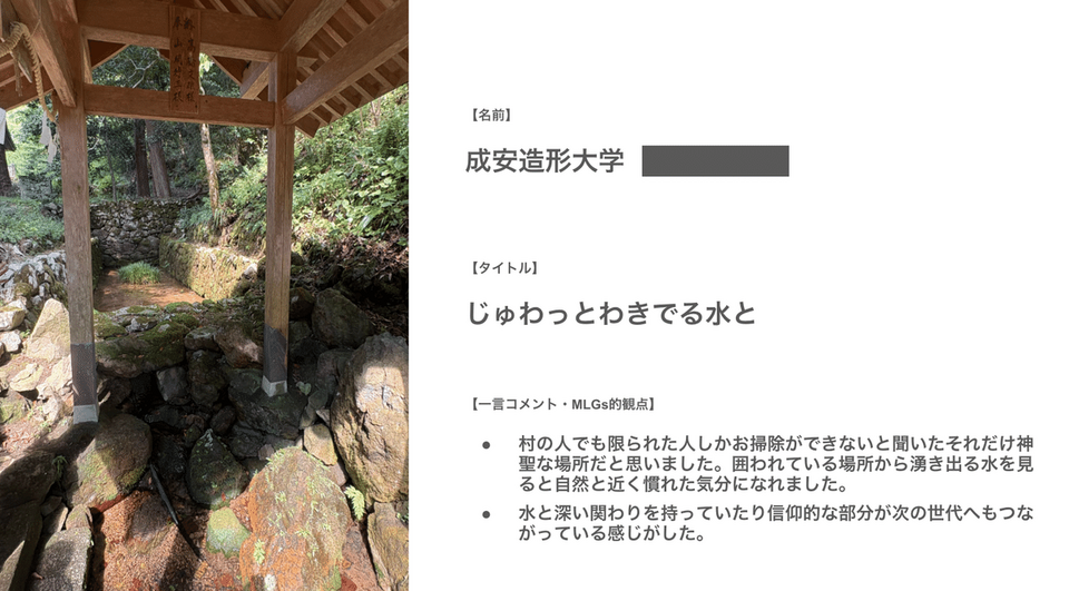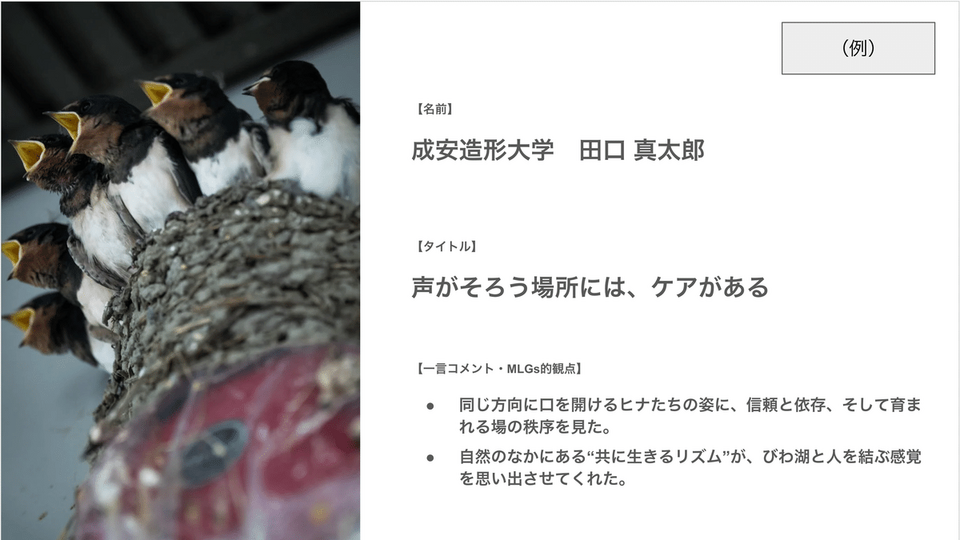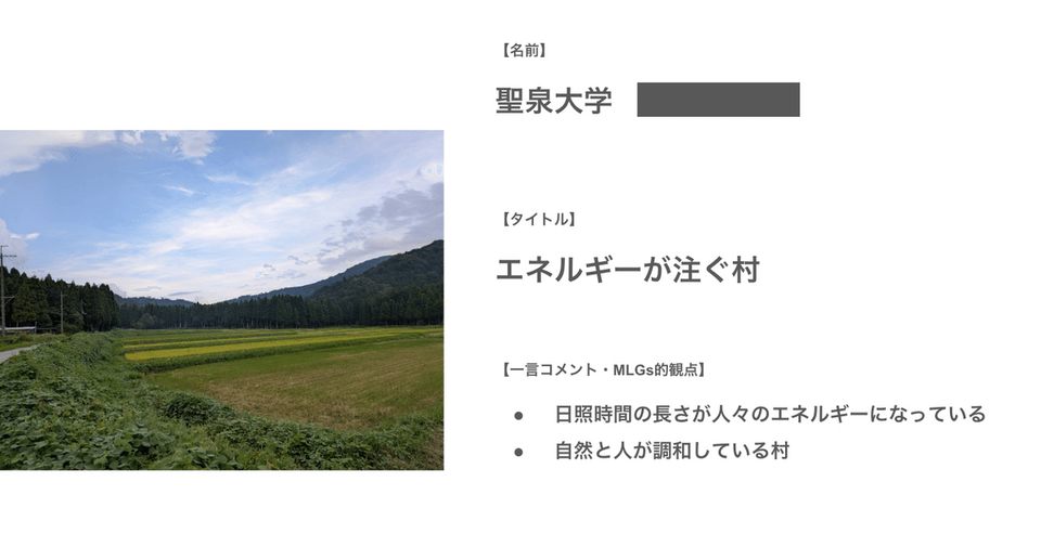 ②スライドの中に、その写真を選んだ理由や、MLGsとの繋がりなどを簡潔な文章でメモ書きする。