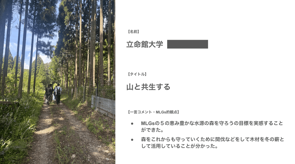 事後学習では、フィールドワークで五感で里山を体験した経験をもとに当日の写真を活用して、MLGsの繋がりや自分の体験を言語化するワークショップを実施しました。