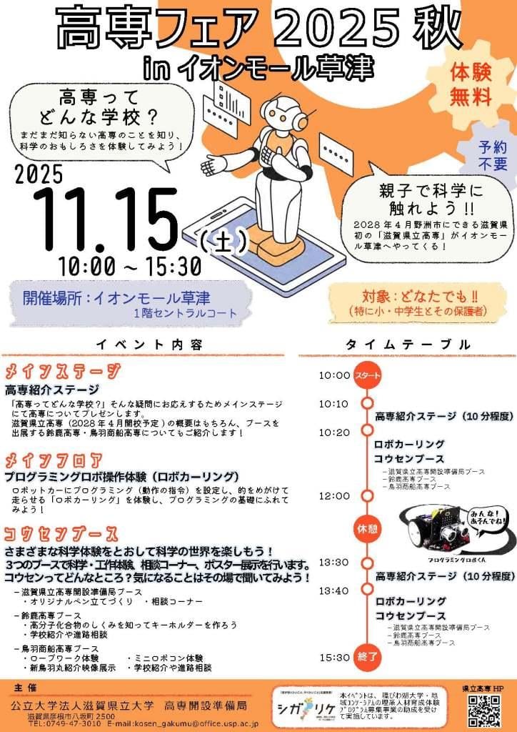 「高専フェア2025秋inイオンモール草津」は、公立大学法人滋賀県立大学高専開設準備局が開催する親子で科学に触れて、ものづくりの楽しさや高専のことを知ってもらうイベントです。
