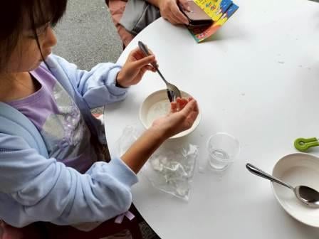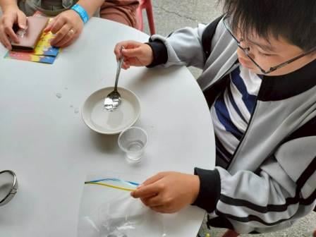 当日は天候に恵まれ、近江鉄道のガチャフェスとのコラボで本学最寄り駅(大学前駅)に600名を超える乗降がありました。その中で、びわ学「つくる 発見! たのしみ隊」には、340名の参加者があり、子どもや大人で終始満席の状況でした。内容は、「つかめる水」です。スプーンですくった透明の液体が、一瞬のうちにつかめる水に変わるという科学実験でした。子どもたちからは「さわると柔らかくてとても気持ちいい」「プニョプニョしてておもしろい」、保護者からは「不思議、どうして?」と驚いたり、楽しんでいる姿が見られました。