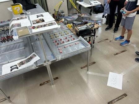 本企画では、理工学部のプロジェクト団体「ロボット技術研究会」が、実際の活動で使用している複数のロボットを展示し、操縦体験を実施しました。二足歩行ロボットや、お菓子を掴んで移動させるアームロボットなどは来場者が実際に操縦できるため、多くの方が楽しんでいる様子が見られました。また、NHK学生ロボコンに出場した機体は展示のみでしたが、実際の大会で動いている様子を映像で紹介し、来場者の関心を集めていました。ロボット技術研究会の活動の魅力が詰まった、充実した企画となりました。