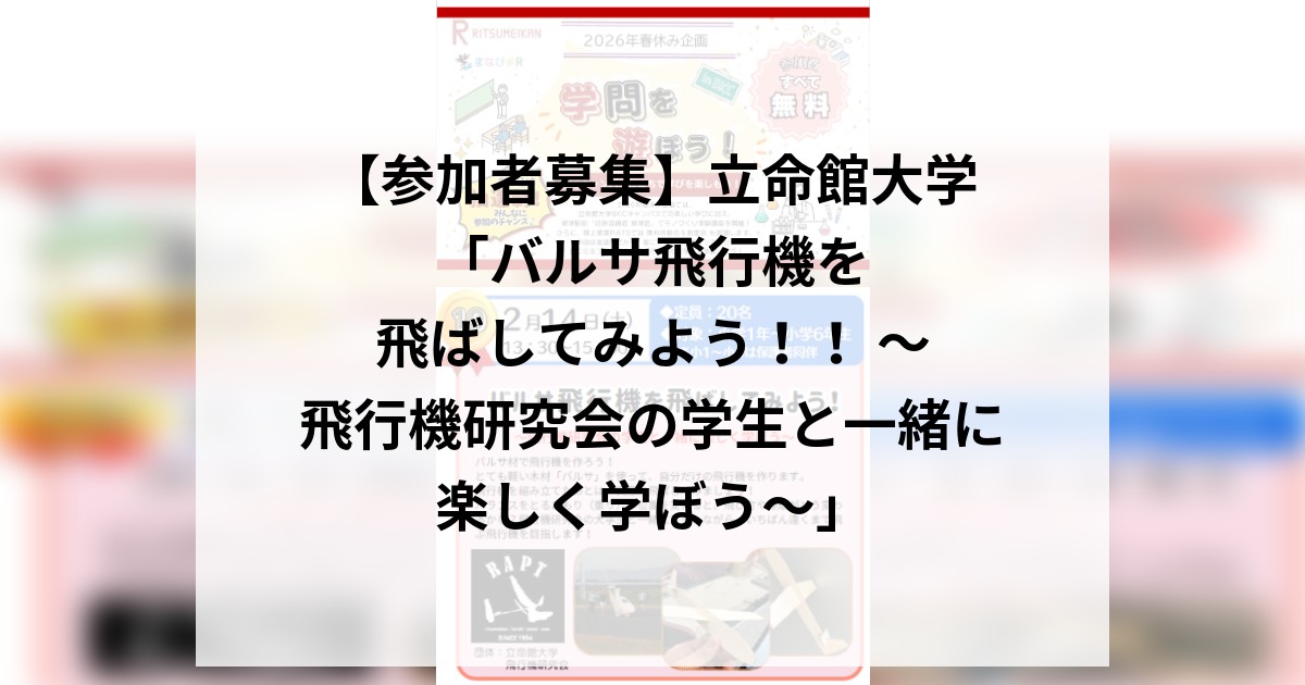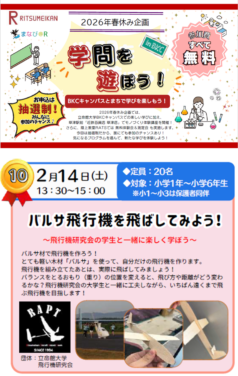 【参加者募集】立命館大学「バルサ飛行機を飛ばしてみよう!! ~飛行機研究会の学生と一緒に楽しく学ぼう~」