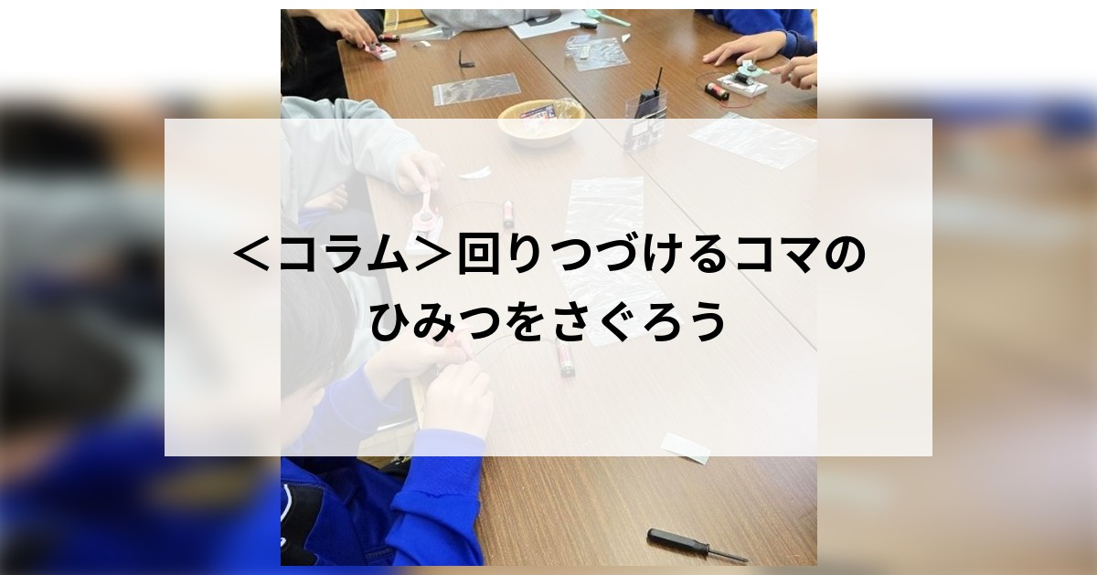 という違いがあることが分かり、「コマはなぜ回りつづけるのか」という疑問を理解する糸口がつかむことができます。実際に小学生(主に高学年)の子どもたちからは、モーターのしくみをきっかけに、もっといろいろ調べてみたい、といったような声も聞こえてきました。この調べてみたいという気持ちは、科学の入り口で、主体的な学びが動き出す瞬間でもあります。コマが回りつづけるように、子どもたちの知りたいという気持ちも止まらず続いていきますように。