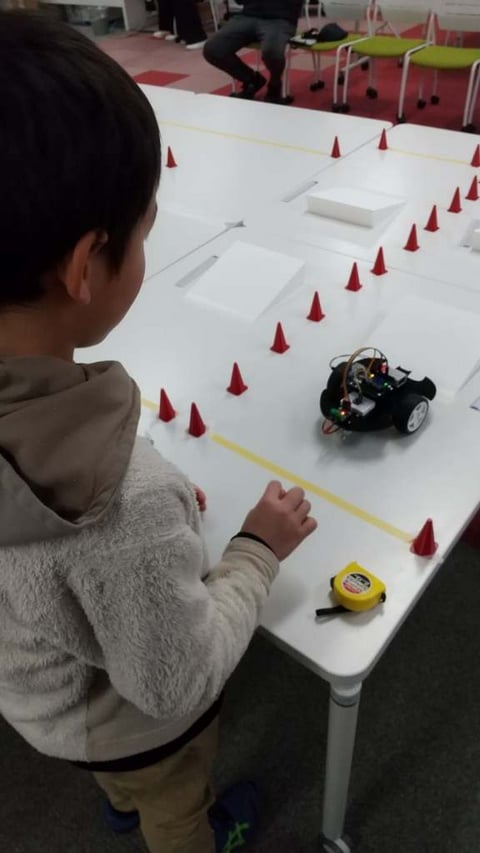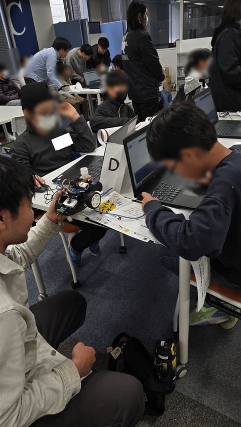 ロボット技術研究会が用意したロボットを使い、子どもたちがプログラミングでロボットの走行に挑戦しました。最初は難しく感じる様子もありましたが、実際にロボットが動くと夢中になってコードを書き換えていました。4人1班ではじめは個人でコードを作ってロボットを走行させていましたが、後半になると班で協力しながら、坂道で落ちないよう止めるコースやスラロームなどに挑戦し、試行錯誤しながら仲間と学ぶ姿が印象的でした。アンケート結果ではまだまだやりたかったなど、時間延長を希望する声も多く寄せられました。