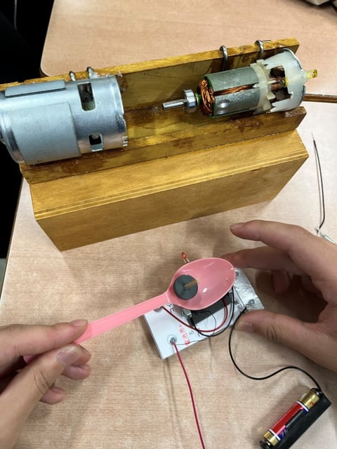 今回の体験は、コマが回る様子を観察しながら「なぜ止まらずに回り続けるのだろう」と不思議を考える小さな科学の旅です。実際に道具を使い、現象を確かめながら進む中で、子どもたちの知りたいという気持ちを引き出します。原理を理解するためにモーターを分解し、コイルと磁石の働きを確かめました。モーターは磁石が固定されコイルが回るのに対し、コマはコイルが固定され磁石が回るという違いに気付くことで、仕みを理解する糸口をつかみます。小学生からは「もっと調べてみたい」という声も聞かれ、コマが回り続けるように探究心も広がっていくことを願っています。