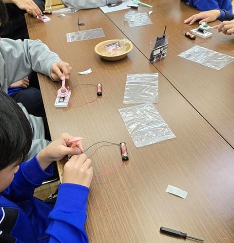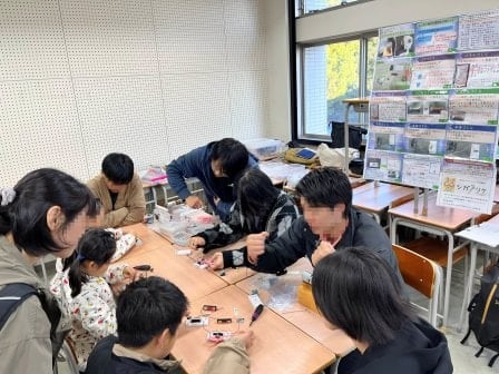 電池のエネルギーを利用して回り続ける不思議なコマを自分の手で作る体験活動を、「青少年のための科学の祭典・滋賀大会」や大津市内の地域イベントなどで実施しました。当日は小学生から高校生まで多くの児童・生徒が参加し、全員がコマを完成させることができました。楽しみながらものづくりに取り組む中で、電気の働きに自然と関心を持つ様子が見られました。また、コマが回り続ける仕組みを理解するための補助教材も活用し、参加した子どもたちが電気の仕組みに興味を持ち、主体的に学びを深めるきっかけとなる様子も見られました。